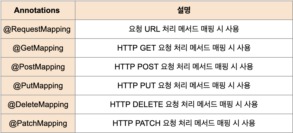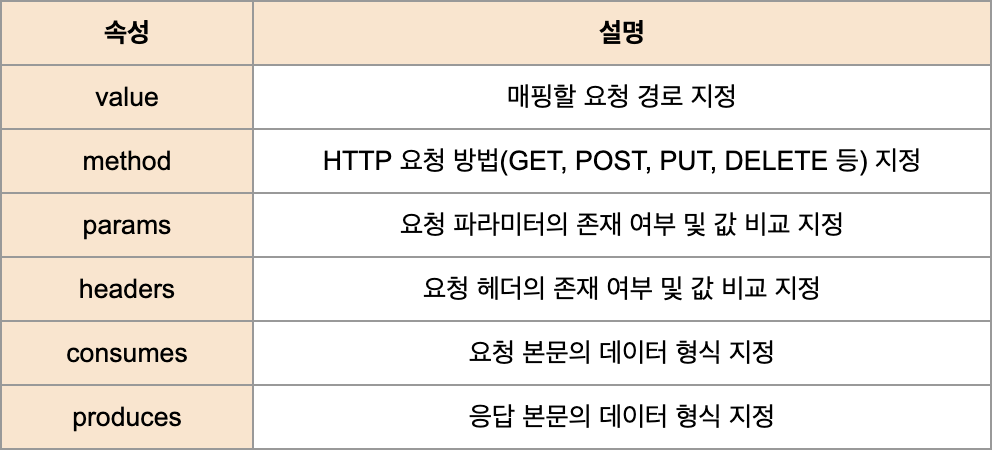 - 다양한 속성(URL, HTTP 메서드, 요청 매개변수, 헤더, 미디어 타입)을 통해 요청과 이를 처리할 메서드를 매핑한다.