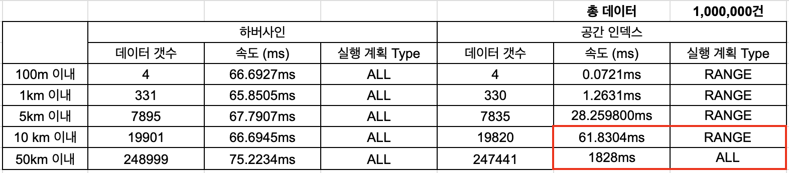 100만건의 row 중 1km 이내 조회 시, 하버사인 공식에 비해 하버사인 공식보다 60배 빠르게 처리되었지만,